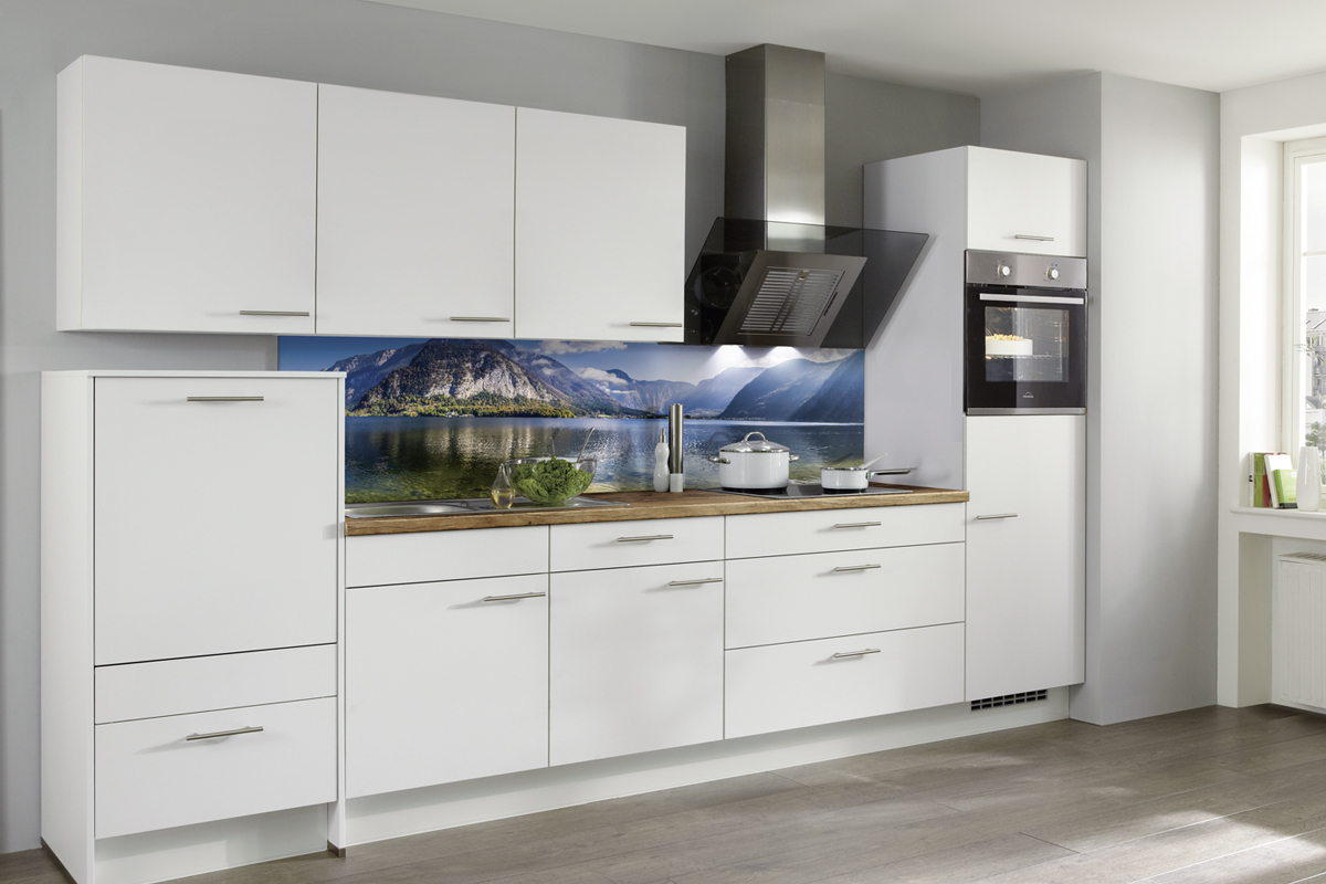 Inklusive Einbaubackofen Edelstahl Premiere 235214 Energieeffizienzklasse A, Glaskeramik Kochfeld Premiere 344504, Dunstesse Edelstahl Premiere 372857-3 Energieeffizienzklasse A, Kühlschrank Premiere 361726 Energieeffizienzklasse E, Einbauspüle Edelstahl Franke AnteaAZN611-86, Unterschrank mit Frontauszügen.